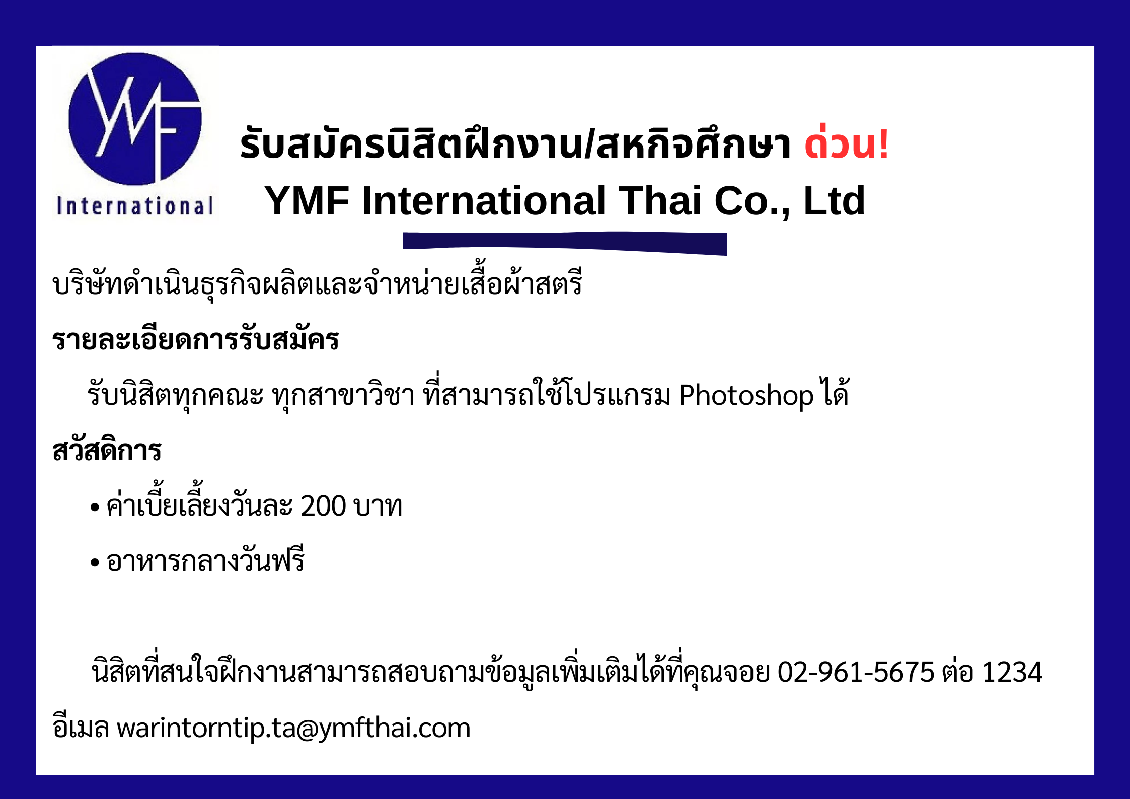 ปี 2568 รับสมัครนิสิตฝึกงาน/สหกิจศึกษา YMF International Thai Co., Ltd