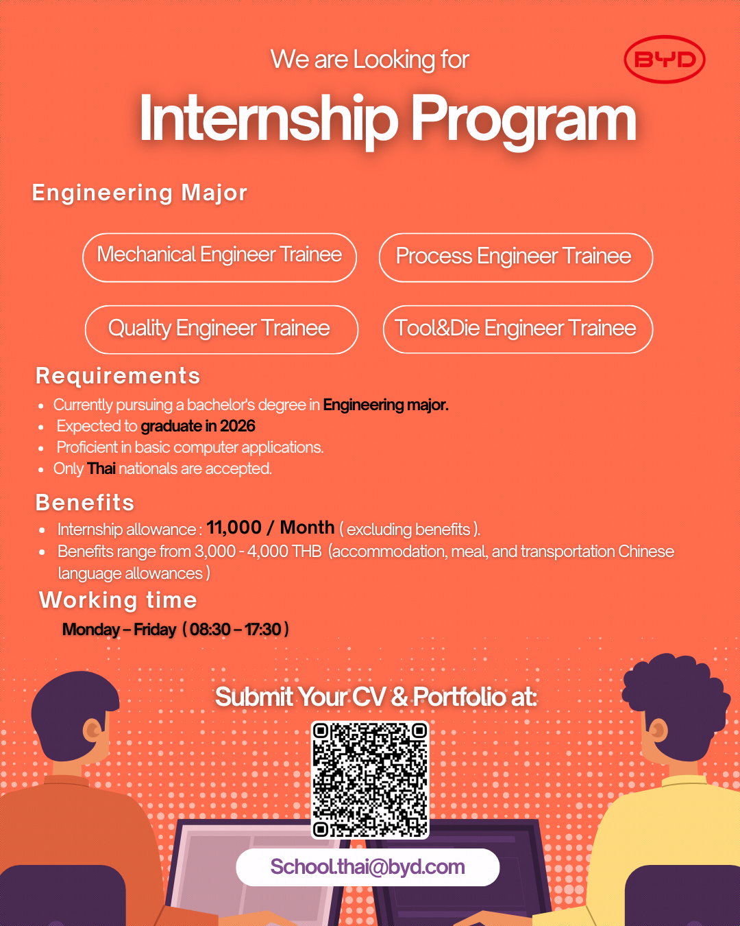 ปี 2568 รับสมัครนิสิตฝึกงาน บริษัท บีวายดี ออโต้ (ประเทศไทย) จำกัด